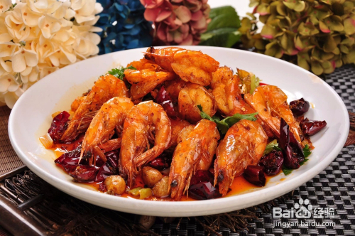 对虾500克,料酒,盐,白糖,醋,姜片,干辣椒,葱花各适量